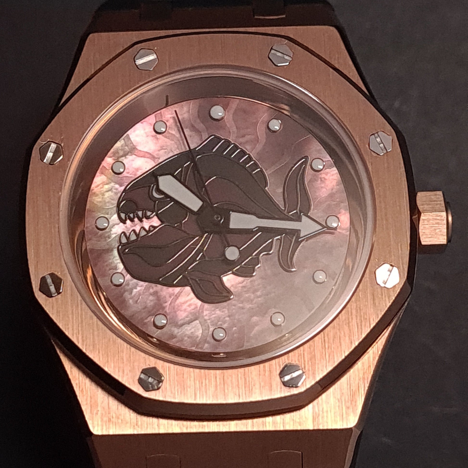 The Piranha Abyss, featuring a vibrant dial with a striking piranha illustration and luminous hands. Encased in a rose gold-toned octagonal bezel and paired with a tough black rubber strap, this watch is powered by the NH35 automatic movement for unmatched reliability.
